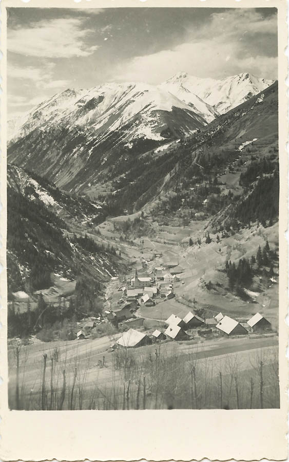 Vue d'Entraigues, et au premier plan le hameau du Villaret, depuis la route, ou le chemin qui mène au Villard. (On voit le chalet de Chanin bien seul sur sa croupe enneigée) Carte photo des années 50-60 Voyez ci dessous le même cliché aujourd'hui. La photo a été très difficile à prendre à cause de la présence nouvelle et formidable des arbres un peu partout. L'été, de la route, on ne voit plus rien, et nous avons dû attendre l'hiver. La jolie maison avec un toit décoré au premierr plan est malheureusement abandonnée (cliquez sur la photo pour l'ouvrir en grand dans un nouveau cadre) |